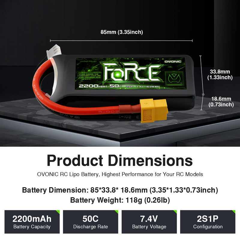 - 2 x OVONIC 2200mAh 2S1P 50C 7.4V Lipo Battery Pack with XT60 & Trx Plug