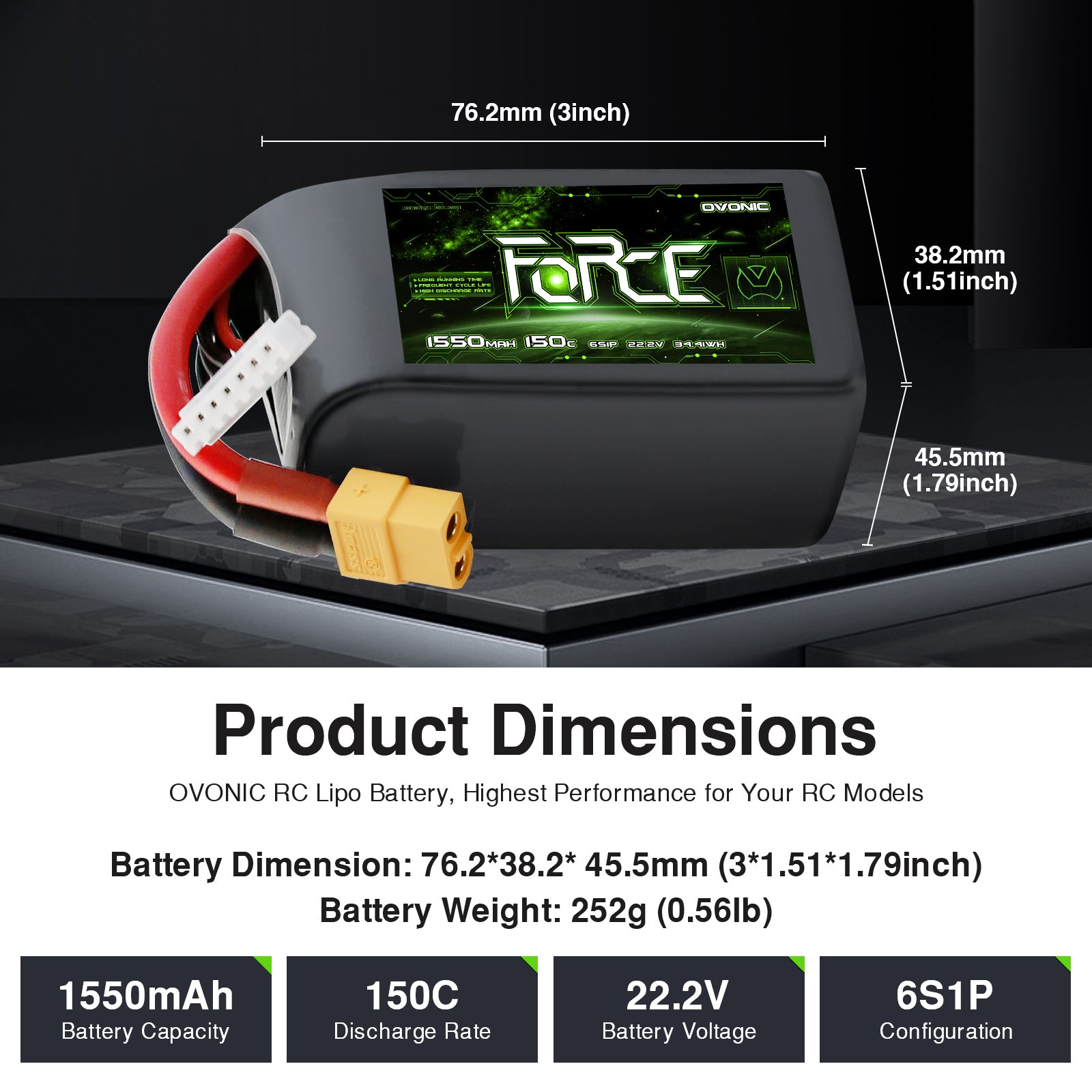 OVONIC Force 1550mAh 6S 150C LiPo Battery is the essential power source for high-performance 6S FPV setups using the XT60 plug.